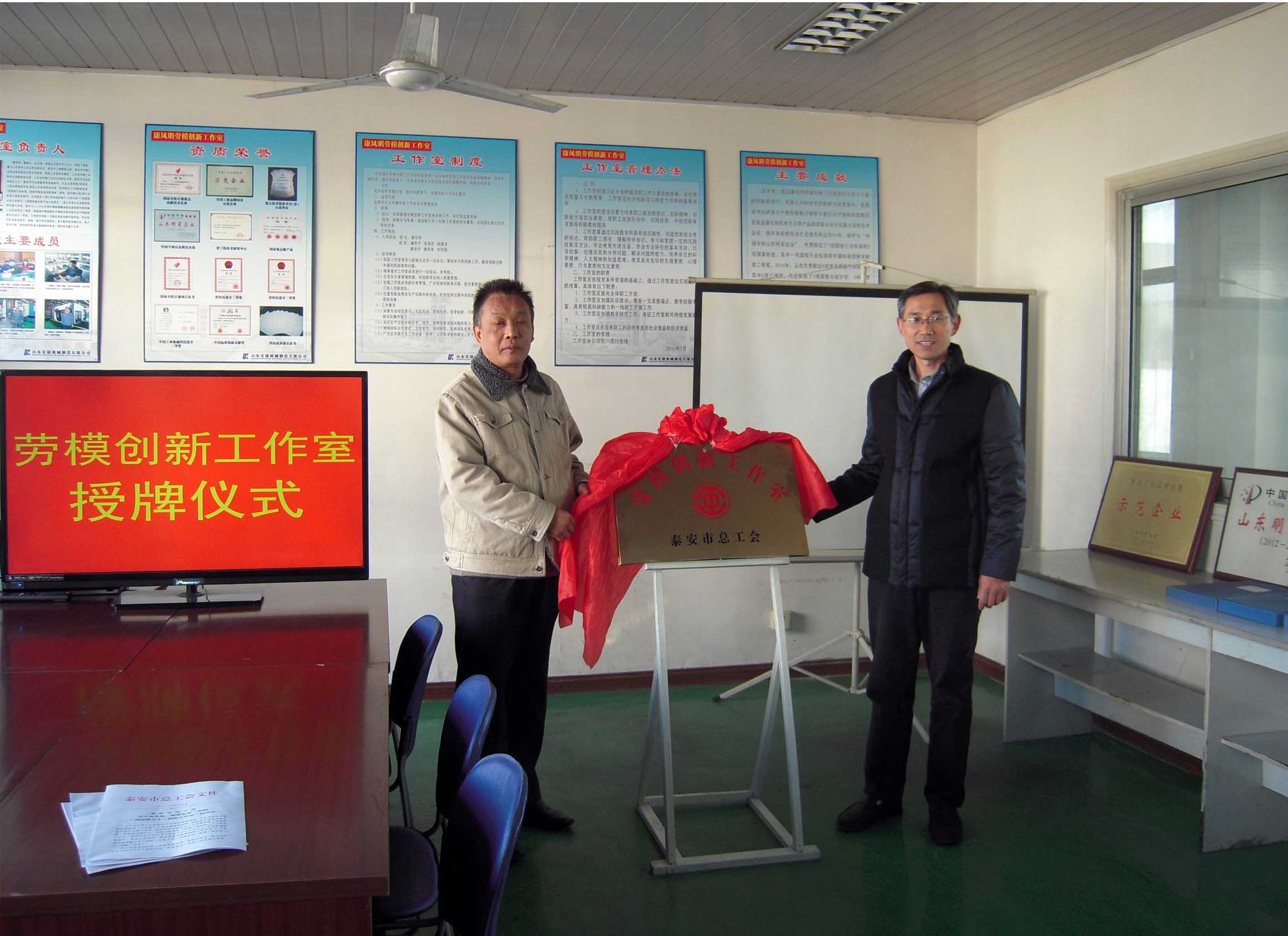 根據(jù)泰會(huì)(2014)50號(hào)《泰安市總工會(huì)關(guān)于命名第二批泰安市“勞模(高技能人才)創(chuàng)新工作室”的決定》文件精神,“康鳳明勞模創(chuàng)新工作室”被命名為第二批泰安市“勞模創(chuàng)新工作室”,這是繼今年5月份“康鳳明勞模創(chuàng)新工作室”被岱岳區(qū)總工會(huì)首批命名后取得的又一殊榮。12月5日,市總工會(huì)生產(chǎn)保護(hù)部部長劉軍、岱岳區(qū)總工會(huì)常務(wù)副主席李福江等市區(qū)部門領(lǐng)導(dǎo)來集團(tuán)公司舉行了揭牌、授牌、掛牌儀式。副總經(jīng)理、工會(huì)主席聶化濤等領(lǐng)導(dǎo)參加了活動(dòng)儀式。